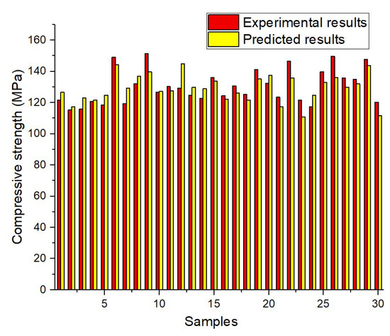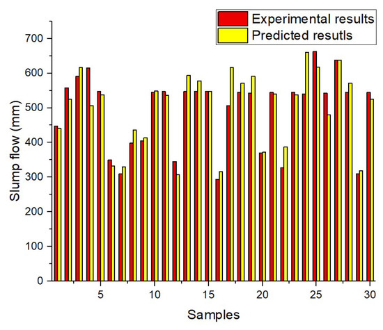 For the validation experiment, 30 distinct mix proportions were designed. In accordance with the test procedure in Section 3, their slump flow and 28 d compressive strength are noted as test results. To acquire the prediction values, enter the mix ratio into the developed ANN prediction model. By comparing the errors between the experimental results and predicted values with the UHPC’s compressive strength and slump flow, we can confirm the forecasting ability of the ANN model. The comparison outcomes are displayed in Figure 7 and Figure 8.