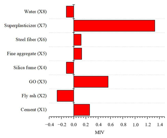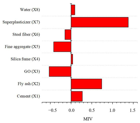 To encourage the engineering use of UHPC, it is crucial to do factor sensitivity analysis. Sensitivity analysis on input parameters is conducted by calculating the MIV and evaluating the impact of each input parameter in the UHPC mix ratio on the 28 d compressive strength and slump flow of UHPC. The calculation of the MIV value is based on the developed ANN model. The input parameters of cement, fly ash, GO, silica fume, fine aggregate, steel fiber, superplasticizer, and water are defined as X1–X8, with a 20% threshold as the lower limit for selecting important variables [63]. The calculation results of the MIV values are shown in Figure 10 and Figure 11. The symbol represents the positive and negative correlations in which the input parameter is related to the output parameter. If the MIV is positive, the input parameter is positively related to the output parameter. If the MIV is negative, then the input parameter is negatively related to the output parameter. The absolute value denotes the relative importance of the influence.