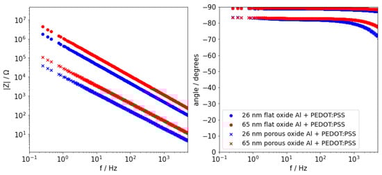 In the formula, C represents the capacitance value, and the electric permittivity in vacuum and the relative permittivity of the dielectric material, respectively, A represents the area between the electrodes and the thickness of the dielectric. According to this, both an increase of the area or a thinning of the dielectric layer between the electrodes result in an increase of the capacitance, which also has an impact on the capacitor impedance. The difference between samples formed with a flat electrode and those formed with a porous one is the surface area. And so it is observed in Figure 1. The porous samples, presenting a larger active surface area, resulted in a larger capacitance and, consequently, in lower impedance values. Additionally, within the sets, there were differences based on the thickness of the dielectric layers. The samples with the thinner oxide layer, 26 nm, depicted lower impedance values compared to their counterparts. It was already observed in a previous work [29] that this difference between oxide thicknesses on a flat oxide can be retrieved even after buried under a number of dry PEDOT:PSS layers, similarly to the response of the samples formed with a flat electrode in Figure 1. Upon the application of PEDOT:PSS onto an etched aluminium substrate, the differences based on the difference in thickness of their dielectric layers could be as well retrieved, despite the increased complexity of the etched surfaces, and had an impact on the impedance of the systems.