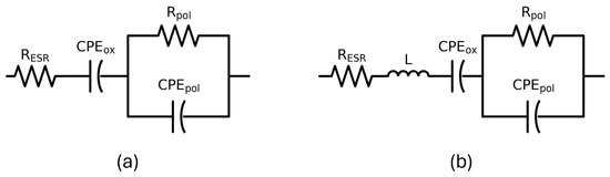 The fitting results (Figure 3) were satisfactory for both systems formed with a flat electrode with grown oxides of different thicknesses (Table 1). However, proper fitting results could not be obtained using the same model for samples formed with a porous electrode. As a result of the decrease of the impedance values, the wires inductance was observed to have an influence on the measurement. Therefore, an inductor was added in series to the model (Figure 2b) accounting for this effect.