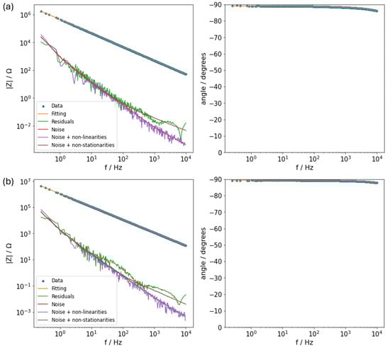 As observed in Figure 4, both samples presented a dip in the noise signals at around 1 kHz that was not observed for the flat samples (Figure 3). This was the result of the potentiostat reaching its limitation when measuring such low impedance values. Nevertheless, the SNR was still high enough not to affect the impedance response at that frequency. Regarding the fitting, the residuals of the fitting overlapped the noise signals for both samples while presenting small deviation on their fitting parameters (Table 2). This meant that the adapted model fitted properly the response of those systems with a porous aluminium substrate and that the fitting parameters could be used for further calculations.