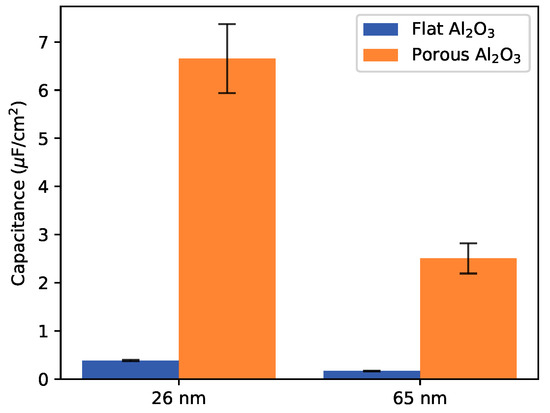 The calculations of the samples capacitance values (Figure 5) showed that the use of a porous aluminium electrode and a thin oxide layer resulted in a capacitance increase of 15 times the capacitance for the flat system for both aluminium thicknesses when using a solid state system.