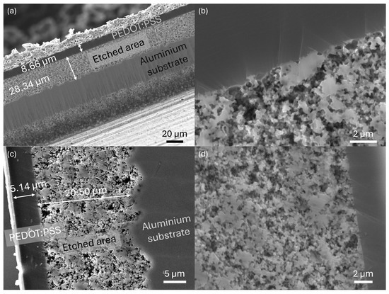 According to the electrochemical analysis, the use of a porous aluminium electrode had an impact on the overall performance. As commented above, the larger the surface of contact between the electrodes, the higher the capacitance values. In order to understand the change that motivated the electrochemical response, a cross-section was performed on the porous samples to be later on studied via surface analysis techniques. In Figure 6 an overview of the stack (a,c) for both samples can be observed. The obtained cross-sections were quite clean and allowed to differentiate between the different layers. Both samples presented an accumulation of PEDOT:PSS outside the porous structure, a clear section of the etched area where the PEDOT:PSS was not filling the pores, and the underlying aluminium substrate. In Figure 6b,d, a close up of the interface between the PEDOT:PSS layer and the porous aluminium layer depicted the close interaction between the two phases. The PEDOT:PSS layer copied the morphology of the outer surface of the porous electrode, even though it did not seem to penetrate further than a few microns deep.