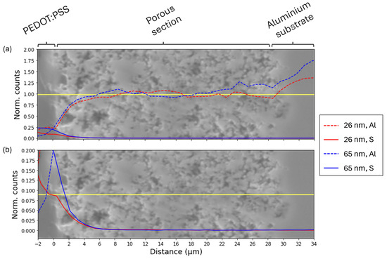 As presented in the linescan (Figure 7), the analysis was carried out starting from the PEDOT:PSS layer into the etched area. The distance 0 m was set as the intersection between the S and Al signals and the counts of all samples were normalized to the average of the Al signal on the etched section. Both signals experienced a change upon the change of phase. The Al signal increased after passing the interface between the outer PEDOT:PSS layer and the etched surface. Thereon, it stabilized for the whole extension of the etched section until it increased again once it reached the aluminium substrate. Focusing on the sulphur signal (Figure 7b), the signal decayed quickly after entering the etched section and it dropped after 6 m. In the graph, the signals of both samples remained constant after 6 m in the porous section. After this drop, the sulphur signals reached a plateau. The sulphur signals for both samples remained constant throughout the etched aluminium section and the aluminium substrate, indicating that the amount of PEDOT:PSS could not be distinguished from the noise level within the porous area.