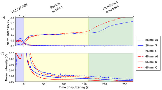 (a) GDOES analysis for PEDOT:PSS/porous aluminium systems with 26 nm (blue) and 65 nm (red) anodized alumina layer. All (dashed) aluminium, (solid) sulphur, and (solid dot) carbon signals were first normalized prior to their analysis. (b) Close up of the carbon and sulphur signal. The different coloured sections depict the areas of the cross-section: (blue) PEDOT:PSS layer, (yellow) porous section and (green) aluminium substrate.
