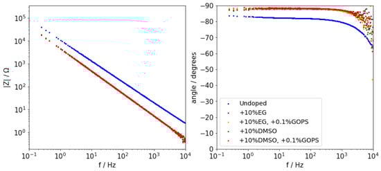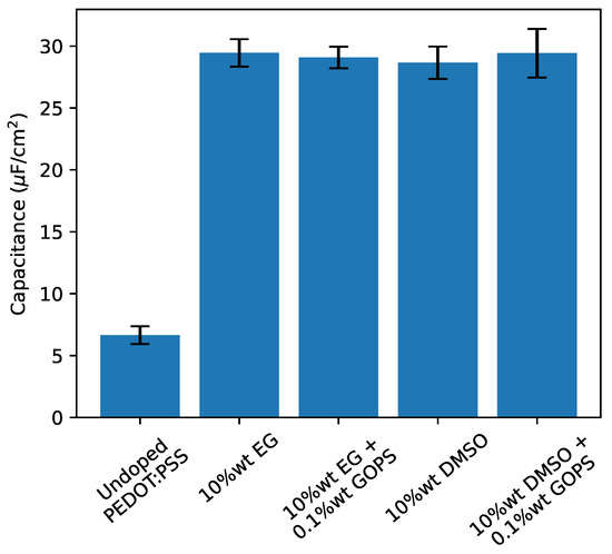 The impact of adding dopants to the PEDOT:PSS dispersion caused the capacitance of the systems to experience an increase of 5 times compared to the undoped sample (Figure 11). As expected from the overlapping impedance signals, the capacitance value obtained out of the CPE components could not be distinguished from one another.