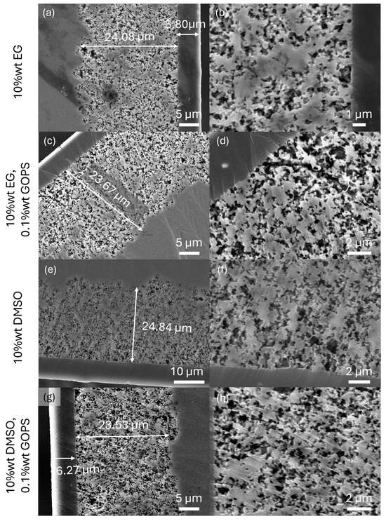 After ascertaining that the addition of dopants had a positive impact on the capacitance of the samples, these were also cut to have access to their cross-section in order to analyse the degree of incorporation of PEDOT:PSS within the porous structure. Similarly to the analysis on the undoped samples (Figure 6a,b), the surface analysis on the cross-section for all doped samples (Figure 12a,c,e,g) depicted an amount of PEDOT:PSS outside the porous section of about 5–7 m and the porous section of the aluminium electrode with empty pores. At a higher magnification (Figure 12b,d,f,h) the tight interaction between PEDOT:PSS and the aluminium was observed, but no polymer flowing into the etched structure could be detected.