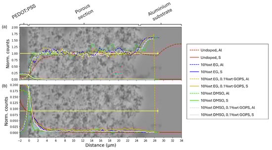 (a) Linescan EDX analysis for PEDOT:PSS/porous aluminium systems with a 26 nm anodized alumina layer for differently doped PEDOT:PSS dispersions (following composition of Table 3). Both (dashed) aluminium and (solid) sulphur signals were first normalized prior to their analysis. (b) Close up of the sulphur signal.