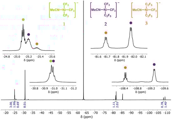 The 19F NMR spectra (Figure 1, complete spectra in the Supplementary Materials) showed the coexistence of (NMe4)[Ni(CF3)3(MeCN)] (1), cis-(NMe4)[Ni(CF3)2(C2F5)(MeCN)] (2), and trans-(NMe4)[Ni(CF3)(C2F5)2(MeCN)] (3) in an approximate ratio of 50/40/10% and confirmed the stereochemistry shown in Scheme 2. The fourth possible compound (NMe4)[Ni(C2F5)3(MeCN)] was not observed.