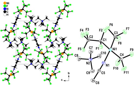 Crystal structure of cis-(NMe4)[Ni(CF3)2(C2F5)(MeCN)] (2) viewed along the crystallographic a axis (left) and molecular structure (right), shown as an ORTEP plot at 40% probability (H atoms omitted). The split occupancy of 20% (NMe4)[Ni(CF3)3(MeCN)] (1) was omitted for clarity.
