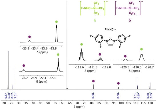 When the mixed precursor material (NMe4)[Ni(CF3)x(C2F5)y(MeCN)] (x + y = 3; 1 to 3) was reacted with fluorinated N-heterocyclic carbene (NHC) ligands as reported elsewhere [], we observed significant amounts of cis-(NMe4)[Ni(CF3)2(C2F5)(L)] via 19F NMR, meaning that the C2F5-containing precursor readily reacts with carbene ligands. For example, in the case of the fluorinated NHC ligand N,N-bis(2,4-difluorophenyl)imidazolylidene (F-NHC), the spectra (Figure 3) show that even a crystalline sample of the material contains only approximately 75 to 80% (NMe4)[Ni(CF3)3(F-NHC)] (4) and 20 to 25% cis-(NMe4)[Ni(CF3)2(C2F5)(F-NHC)] (5).