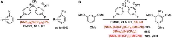 [Ni(CF3)4]2− can catalyze C–H bond trifluoromethylations of electron-rich (hetero)arenes in up to 99% yield (Scheme 1A) using Umemoto Reagent II (2,8-difluoro-S-(trifluoromethyl)dibenzothiophenium triflate) in DMSO [].