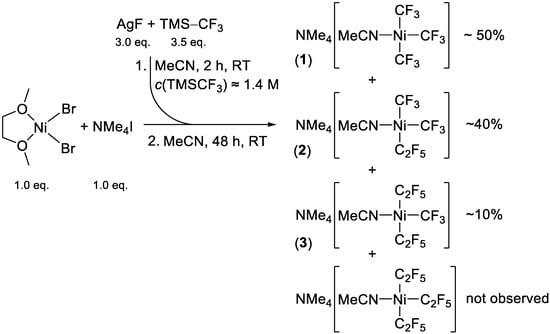 Initial reaction protocol for the synthesis of (NMe4)[Ni(CF3)3(MeCN)] (1), producing mixtures of 1 and the perfluoroethyl derivatives (NMe4)[Ni(CF3)2(C2F5)(MeCN)] (2) and (NMe4)[Ni(CF3)(C2F5)2(MeCN)] (3).