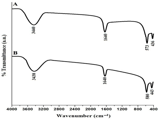 The FTIR analysis of the SG and SA ZnFe2O4 nanoparticles is clarified in Figure 2A,B, respectively. The presence of broad absorption peaks at 3440 cm−1 for SG and 3438 cm−1 for SA is generally linked to the stretching vibrations of O-H, suggesting hydroxyl groups on the nanoparticles’ surface or the adsorption of water molecules. Furthermore, the peaks at 1640 cm−1 in both SG and SA samples are commonly associated with O-H bending vibrations, which also point to hydroxyl groups on the nanoparticles’ surface or the adsorption of water molecules. Each set of samples displays two prominent peaks, located at 573 and 436 cm−1 for the SG, and 580 and 443 cm−1 for the SA, respectively. These bands are emblematic of the metal-oxygen stretch vibrations located within the tetrahedral (Zn-O) and octahedral (Fe-O) sites [36].