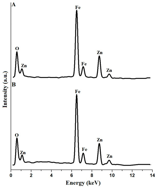 The EDX analyses of the SG and SA samples yield critical compositional insights into the ZnFe2O4 nanoparticles created with glutamine and L-arginine as fuels, as depicted in Figure 3A,B, respectively. The fundamental elements, oxygen (O), iron (Fe), and zinc (Zn) are present in both samples of ZnFe2O4. For the SG sample, the elemental composition by weight percentage is detailed as O: 25.34%, Fe: 46.23%, and Zn: 28.43%. In a parallel vein, the SA sample presents percentages of O: 25.54%, Fe: 46.48%, and Zn: 27.98%. These spectral data indicate that the proportions of O, Fe, and Zn align well with the chemical structure of zinc ferrite, nominally represented by the ratio Zn:Fe:O (1:2:4).