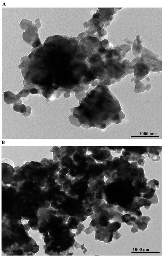 In the presented HR-TEM images (Figure 5), a discernible difference in particle size of irregular shapes between the SG (Figure 5A) and SA (Figure 5B) synthesized products is evident. The average particle size was determined to be approximately 300.02 nm for SG and 231.27 nm for SA. It is surmised that the larger particle sizes observed for both samples compared to XRD may be attributed to the coalescence of primary particles. Such coalescence leads to an aggregation of nanocrystals, forming larger secondary particles that are observable in the HR-TEM images.