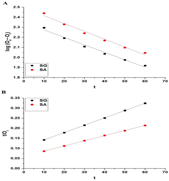 Linear kinetic modeling of rhodamine b dye adsorption onto the SG and SA samples by the pseudo-first-order (A) and pseudo-second-order (B) kinetic plots.
