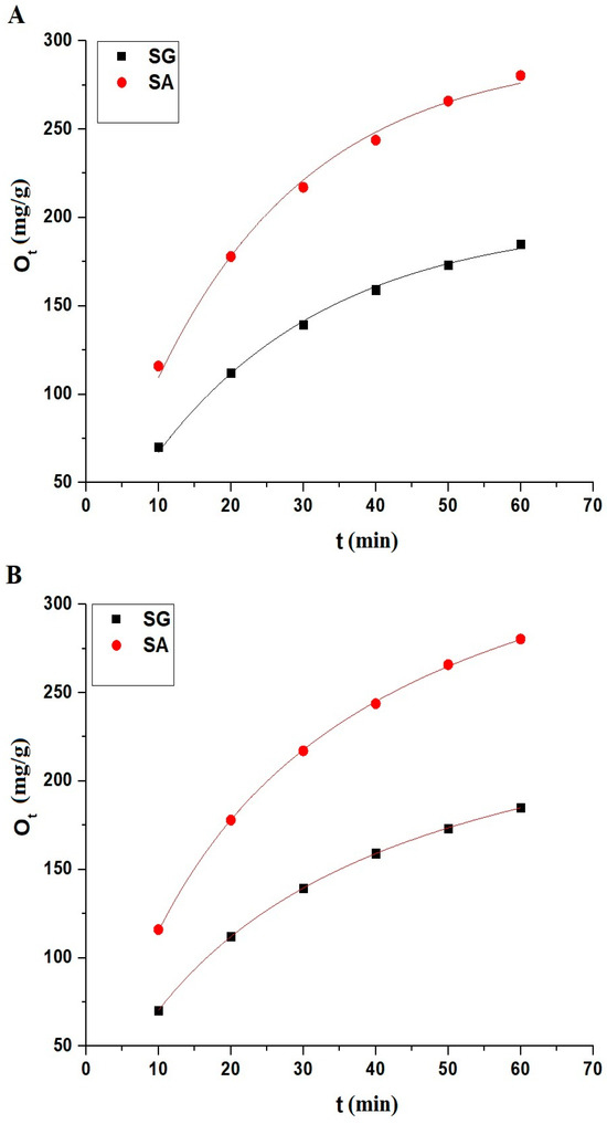 Nonlinear kinetic modeling of rhodamine b dye adsorption onto the SG and SA samples by the pseudo-first-order (A) and pseudo-second-order (B) kinetic plots.