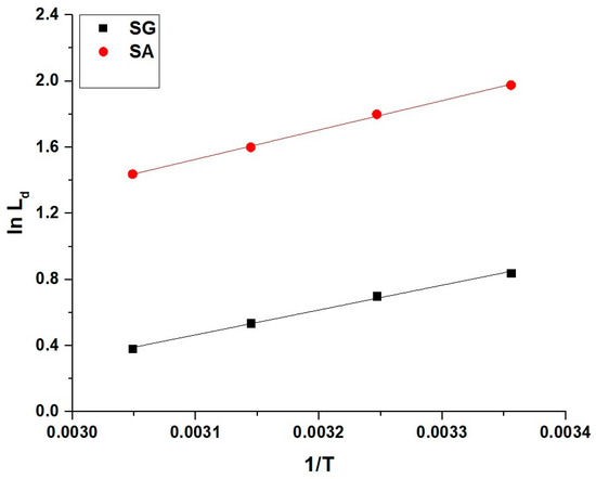 Thermodynamic analysis of rhodamine b dye adsorption on the SG and SA samples via Van’t Hoff plots.