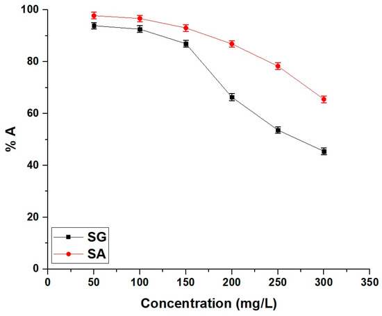 Figure 13 demonstrates the impact of the initial concentration of rhodamine b dye on the adsorption effectiveness of the SG and SA samples. In both cases, the percentage of rhodamine b dye adsorption diminishes with an increase in the initial dye concentration. At lower concentrations of the dye, there are abundant active sites available compared to the number of dye molecules present, resulting in higher adsorption percentages. However, as the concentration of the dye in the solution rises, these active sites become progressively occupied. Eventually, a saturation point is reached where additional dye molecules cannot be readily accommodated, leading to a decline in adsorption efficiency [37,38].