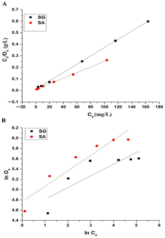 Equilibrium linear modeling of rhodamine b dye adsorption onto the SG and SA samples by the Langmuir (A) and Freundlich (B) equilibrium plots.