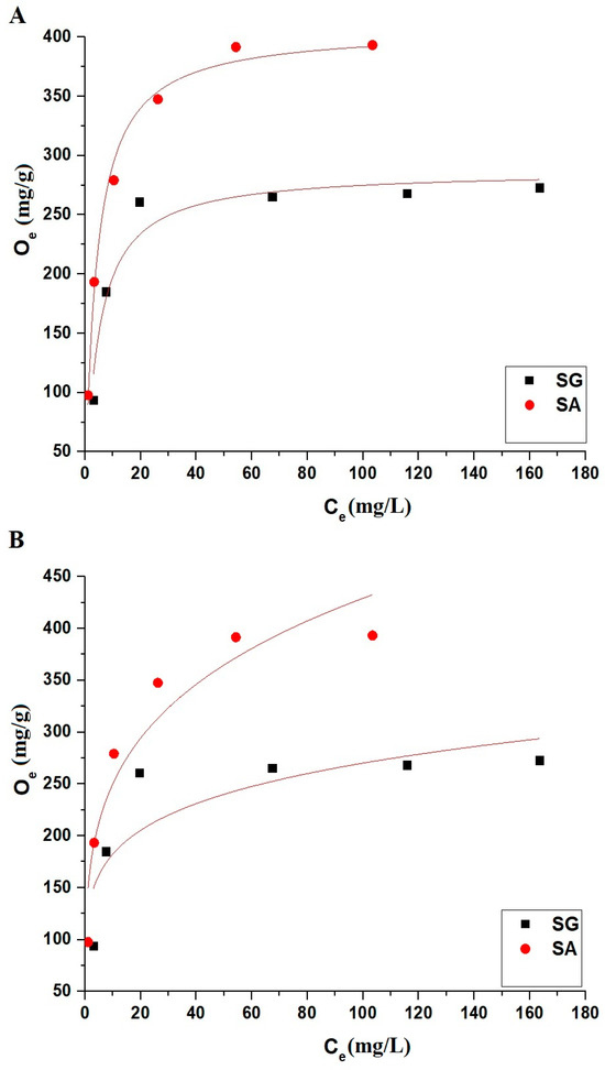 Equilibrium nonlinear modeling of rhodamine b dye adsorption onto the SG and SA samples by the Langmuir (A) and Freundlich (B) equilibrium plots.
