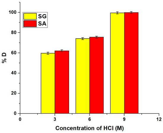 To evaluate the feasibility of regenerating and reusing the SG and SA adsorbents, desorption experiments were carried out using 50 mL of different HCl concentrations (3, 6, and 9 M) as an eluent for rhodamine b dye, as depicted in Figure 16. Additionally, the percentage of desorption (% D) of rhodamine b dye from the SG or SA adsorbents was calculated by applying equation 13 [41].