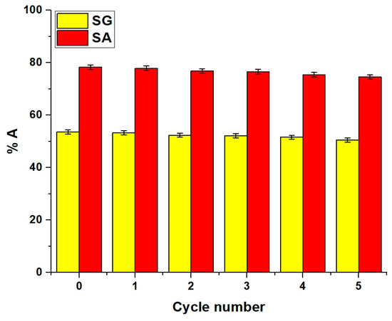 Effect of reusability of the SG and SA adsorbents on the sorption of rhodamine b dye. Experimental conditions: initial dye concentration = 250 mg/L, volume of dye solution = 100 mL, amount of adsorbent = 0.05 g, pH = 10, contact adsorption time = 70 min, adsorption temperature = 298 K, concentration of HCl eluting agent = 9 M, volume of HCl = 50 mL, desorption time = 30 min.