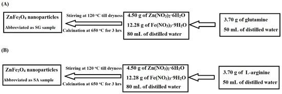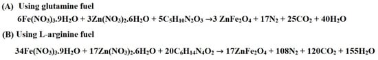 Production of zinc ferrite (ZnFe2O4) nanoparticles by the combustion method using glutamine (A) and L-arginine (B) fuels.