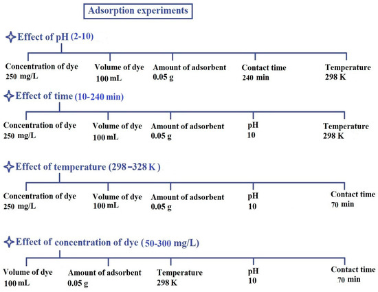 The adsorption experiments were conducted to evaluate the efficacy of the SG and SA products in the removal of rhodamine b dye. The impact of various parameters on the adsorption process was systematically investigated. All experiments were performed in the dark to ensure that the removal of rhodamine b dye was due to adsorption and not photocatalytic degradation. Initially, the effect of pH on rhodamine b dye adsorption was assessed over a 2–10 pH range. In these experiments, a rhodamine b dye concentration of 250 mg/L was utilized, with the volume of rhodamine b dye fixed at 100 mL and the amount of adsorbent set at 0.05 g. The mixture was allowed to interact for a contact time of 240 min at a constant temperature of 298 K. Subsequently, the effect of contact time was examined by varying the interaction period from 10 to 100 min. The concentration of rhodamine b dye and volume remained constant at 250 mg/L and 100 mL, respectively, with an adsorbent amount of 0.05 g. These experiments were carried out at a pH of 10 and a temperature of 298 K. In addition, the effect of temperature on the adsorption efficiency was explored within a 298–328 K range, maintaining the rhodamine b dye concentration, volume of rhodamine b dye, and amount of adsorbent at 250 mg/L, 100 mL, and 0.05 g, respectively. The pH was held at 10, with a fixed contact time of 70 min. Furthermore, the influence of rhodamine b dye concentration on the adsorption efficiency was studied by altering the concentration of rhodamine b dye from 50 to 300 mg/L. Each experiment was conducted with 100 mL of rhodamine b dye solution and 0.05 g of adsorbent at a pH of 10 and a temperature of 298 K for a duration of 70 min. In the final step, magnetic separation using a magnet was employed to remove the magnetic ZnFe2O4 nanoparticles, and the resulting filtrates underwent evaluation to measure the remaining concentration of rhodamine b dye with the aid of a Shimadzu 1800 UV/Vis spectrophotometer (Shimadzu Corporation, Kyoto, Japan). This magnetic separation technique is not only efficient but also cost-effective and simple to implement, ensuring that the nanoparticles do not pose a risk of secondary contamination in the effluent. Scheme 4 summarizes the previous practical steps for the removal of rhodamine b dye by the SG and SA products.