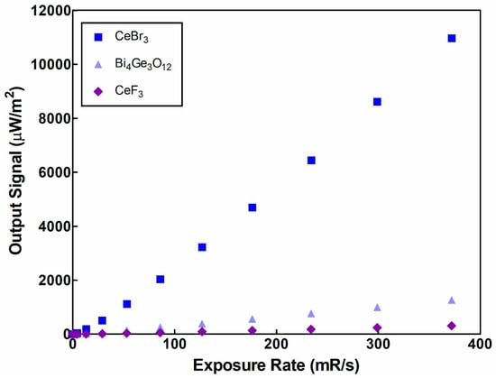 Figure 1 shows the signal reading produced by the CeF3 crystal, after X-ray irradiation, compared to the X-ray exposure rate. In the same Figure can be seen the output signal of the CeBr3 and BGO crystals, under similar irradiation conditions. All the crystal samples had a purity of >99.99% (personal communication with Advatech (London, UK). From Figure 1, it can be depicted that the output signal and the exposure rate of the medical X-ray tube can be considered linear in the examined energy range (0 to 372 mR/s), except for CeBr3 where linearity is lost for less than 50 mR/s. However, the replacement of bromine with fluorine in CeBr3 results in a significant reduction in the signal output curve (from 29.54 in CeBr3 to 0.834 in CeF3). The output signal of BGO, which is a commercially available crystal in medical imaging applications, is also greater than that of CeF3, denoting that CeF3 has a low light yield for medical applications in the energy range 50–140 kVp.