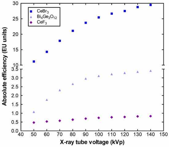 The combination of the multialkali photocathode with CeF3 results in the effective efficiency values being reduced by 2.58% compared to the absolute efficiency values at 140 kVp. In the case of the combination of CeF3 with the gallium arsenide photocathode, the corresponding absolute efficiency reduction is 24.26% at 140 kVp.