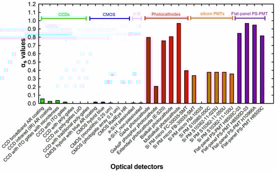 As can be depicted from Figure 3, the spectral matching factors between CeF3 and most of the CCDs and CMOS are close to zero. However, CeF3 can be matched with a variety of optical sensors, such as silicon (SiPMs), position-sensitive photomultipliers, etc., which are used in nuclear medicine applications [83,84]. For example, the emission spectrum of CeF3 has a 97% match with the spectral sensitivity of multialkali photocathodes and flat-panel position-sensitive (PS) photomultipliers (H8500D-03) (for both, the spectral matching factor is 0.97). Lower compatibility values can be found with gallium arsenide (GaAs) photocathodes (αs = 0.8) and the extended (E-S20) photocathode used to measure the luminescence efficiency signal in this work (αs = 0.76). This value is also used for the calculation of the AE.