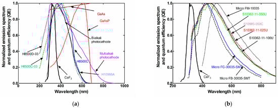The spectral responses that were used for the calculation of the αs between CeF3 with a series of light sensors are shown in Figure 4 and Figure 5, along with the emitted spectrum of CeF3 [68]. Figure 4 shows the grouped spectral responses of the photocathodes (Figure 4a) and silicon photomultipliers (Figure 4b), whereas Figure 5 shows the grouped spectral responses of the CCDs (Figure 5a) and CMOS (Figure 5b).