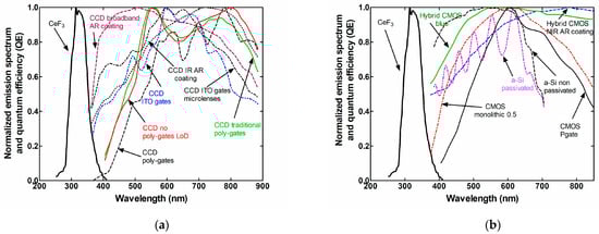 Spectral responses of (a) CCDs and (b) CMOS, along with the emission spectrum of CeF3.
