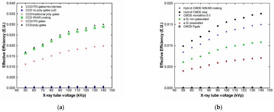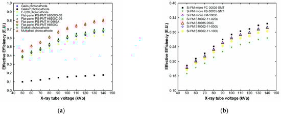 The CeF3 spectral matching results, presented in the spectral matching factors data of Figure 3, were used to calculate the EE that could be produced upon coupling the specific crystal with the examined optical sensors. Figure 6 and Figure 7 show the calculated effective luminescence efficiency values with the X-ray tube voltage for the above-mentioned optical sensors. Figure 6 shows the grouped spectral responses of the photocathodes (Figure 6a) and silicon photomultipliers (Figure 6b), whereas Figure 7 shows the grouped spectral responses of the CCDs (Figure 7a) and CMOS (Figure 7b).