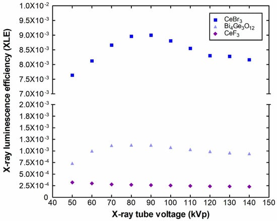 Figure 8 shows the X-ray luminescence efficiency of the CeF3 crystal compared to the data for CeBr3 and BGO, in the examined X-ray tube voltage range. The XLE is an important parameter for detectors that are operated as energy integrators. This type of sensor is used in medical imaging systems, in which the signal output is related to the amount of energy that is captured by the crystal. The CeF3 XLE values are below the corresponding ones for CeBr3 and BGO as was expected from the previous findings (Figure 1 and Figure 2). They start from 3.2 × 10−4 at 50 kVp and drop down to 2.3 × 10−4 at 140 kVp. The corresponding values for CeBr3 and BGO were 7.6 × 10−3 and 7.3 × 10−4 at 50 kVp, reaching a maximum of 8.9 × 10−3 (CeBr3 at 90 kVp) and 1.1 × 10−3 (BGO at 80 kVp) and afterwards, both drop down to 8.2 × 10−3 and 9.4 × 10−4 at 140 kVp, respectively. In the case of CeF3, even the characteristic K-edge (at ~40 keV as shown in Figure 9) does not contribute to an XLE increase, like in the case of CeBr3, with a K-edge at almost the same energy with CeF3 (~40 keV) or BGO (~90.5 keV).