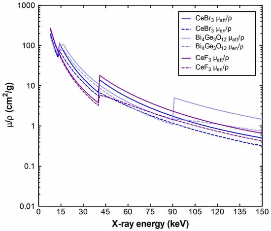Figure 9 shows the calculated attenuation coefficients (μatt) and the energy absorption (μen) coefficients of CeF3, CeBr3 and BGO, in the energy range 8 to 150 keV. The elemental coefficients (cerium, fluorine, bromine, bismuth (Bi), germanium (Ge) and oxygen (O)) that were used to calculate the CeF3, CeBr3 and BGO mixtures were obtained from the NIST XmuDat database [90,91]. The decrease in the coefficients, except from the sudden increase due to the characteristic K-absorption, for every mixture point, where the probability of photoelectric interaction maximizes, can also be seen in Figure 9.