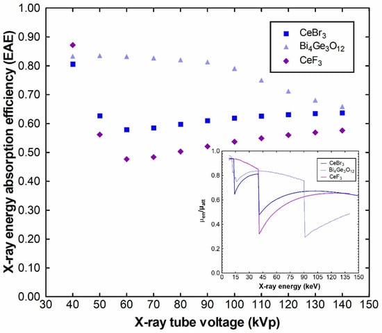 Figure 10 shows the EAE values of CeF3 compared to CeBr3 and BGO. The energy absorption efficiency strongly depends on the μen and μatt coefficients, shown in Figure 9, as well as on their ratio (μen/μatt, Equation (4)), shown as an inset in Figure 10. Initially, for energies up to 39 keV, CeF3 maintained a higher attenuation coefficient ratio than both CeBr3 and BGO, leading to a higher energy absorption efficiency value at 40 kVp. However, when the energy increases, the energy absorption of BGO showed superior energy absorption efficiency values across the examined energy range, due to the combined effects of the density, higher μen/μatt ratio (from 39 to 90 keV) and the increase in absorption due to the K-edge. Both CeBr3 and CeF3 have close attenuation coefficient values due to the presence of cerium (gram atomic mass = 140.116 g/mol) in both crystals; however, the influence of the three atoms of bromine (gram atomic mass = 79.904 g/mol) is stronger than the corresponding three atoms of fluorine (gram atomic mass = 18.998 g/mol), leading to a gram molecular mass for CeF3 equal to 197.111 g/mol compared to 172.549 g/mol for CeBr3. After the K-edge absorption, CeF3 exhibits a lower μen/μatt ratio and consequently lower EAE values up to 129 keV across the examined energy range.
