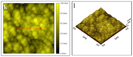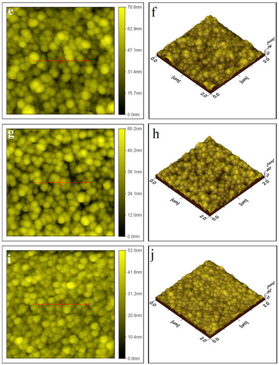 AFM 2D and 3D images of thin films: (a,b) as deposited, (c,d) annealed at 100 °C, (e,f) annealed at 200 °C, (g,h) annealed at 300 °C, (i,j) annealed at 400 °C, and (k,l) annealed at 500 °C.