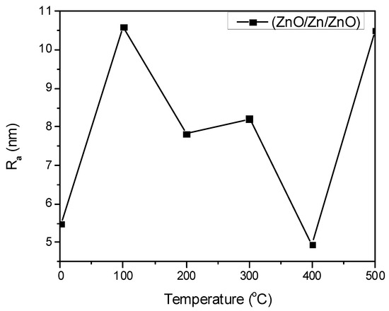 Figure 1 shows atomic force microscopy (AFM) images of annealed thin films in comparison to as-deposited films, whereas Figure 2 describes the influence of annealing temperature on the average roughness (Ra) of the films. Ra measures the average length between the peaks and valleys and the deviation from the mean line on the entire surface within the sampling length. From Figure 1, one can observe that Ra first increases with an increase in the annealing temperature and then decreases to a minimum value. A minimum roughness was observed for the sample annealed at 400 °C, which is about 4.95 nm. A further increase in the annealing temperature results in an increase in the Ra value. A maximum Ra value was obtained for the sample annealed at 500 °C, which is about 10.60 nm. The initial decrease in roughness with increasing annealing temperature was attributed to the coalescence of the grains. A further increase in roughness with an increase in the annealing temperature may be due to the further increase in grain size. Moreover, the heterostructure is composed of three layers; that is, Zn is sandwiched between the ZnO layers. The melting point of Zn is 420 °C, whereas that of ZnO is 1975 °C. Increasing the annealing temperature from 400 °C to 500 °C changed the Zn phase from solid to liquid. The liquid Zn layer might penetrate or percolate into the interstitial pores in the underlying ZnO layers. This penetration can lead to a disruption in the uniformity of the ZnO structure, as the liquid Zn may fill voids and create localized regions of different densities or compositions. As can be seen, an increase in the peaks and valleys in the film results in an increase in the average roughness above the optimum value of the annealing temperature. The infiltration of liquid Zn into the ZnO layers can also promote the formation of microcracks or other structural imperfections as the film cools down and as Zn solidifies, leading to an increase in the Ra of the film. Furthermore, the increase in Ra at higher annealing temperatures can be linked to the thermodynamic instability introduced by the liquid phase of Zn. As Zn re-solidifies upon cooling, it may not return to its original crystalline orientation, leading to further imperfections and non-uniformities in the ZnO/Zn/ZnO heterostructure.