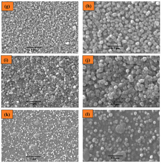 SEM images of thin films with low and high magnifications: (a,b) as deposited, (c,d) annealed at 100 °C, (e,f) annealed at 200 °C, (g,h) annealed at 300 °C, (i,j) annealed at 400 °C, and (k,l) annealed at 500 °C.
