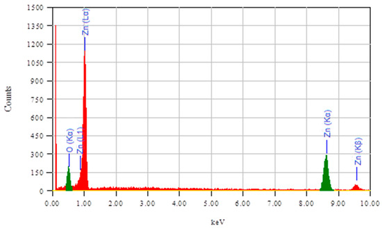 From the table, we can see that the average particle size decreases with an increase in the post-heat treatment (annealing temperature). An optimum value of the particle size was calculated for the sample annealed at 400 °C. A further increase in temperature in the middle layer, which is comprised of Zn, affects the surface morphology and smoothness of the films. Figure 4 shows the energy dispersive X-ray (EDX) spectra of the film annealed at 400 °C, confirming that ZnO film is deposited.