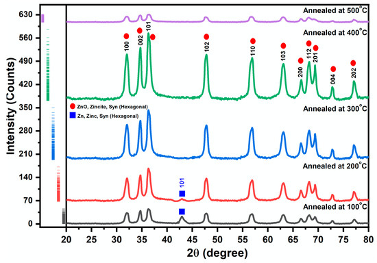 XRD spectra of ZnO/Zn/ZnO thin film annealed at 100, 200, 300, 400, and 500 °C.