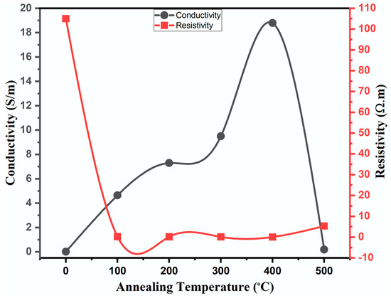 Figure 6 shows the electrical resistivity and conductivity of the thin films annealed at different temperatures. In addition, Table 2 lists the electrical resistivity and conductivity values of the annealed and deposited thin films. From the figure and table, we can see that the electrical resistivity/conductivity of the film changes with an increase in the annealing temperature. The electrical behaviour demonstrates a complex relationship among particle size, surface roughness, and electrical conductivity, which is closely connected to the microstructural evolution during thermal annealing. The electrical conductivity of the thin films exhibited a substantial increase from the as-deposited state to a thin film annealed at 400 °C, as displayed in Figure 6. This improvement in conductivity is linked to the reduction in particle size and enhancement in crystalline quality, as demonstrated by the XRD analysis, as well as a corresponding decrease in surface roughness, which facilitates crystalline quality. The decrease in surface roughness from the as-deposited thin film to the 400 °C annealed film indicates a smoother film surface, which minimizes scattering sites for charge carriers, thus enhancing conductivity. Smaller particle sizes and improved crystal structures decrease the number of grain boundaries, which are known to act as scattering centres for charge carriers (electrons and holes) [38,39,40]. The reduction in grain boundary scattering allows for more efficient carrier transport, thereby increasing the electrical conductivity of the films. However, a significant change occurred at 500 °C, where the particle size increased dramatically and the conductivity dropped sharply. This decline in conductivity can be ascribed to the formation of larger grains, which may introduce structural imperfections such as microcracks. These imperfections likely result from thermal stress or excessive grain growth, which disrupts the crystal structure and increases the scattering of carriers, ultimately leading to a higher electrical resistance [41]. This phenomenon aligns with the established understanding that while smaller grains typically increase resistance due to grain boundary scattering, excessively large grains can introduce new defects that also adversely affect conductivity.
