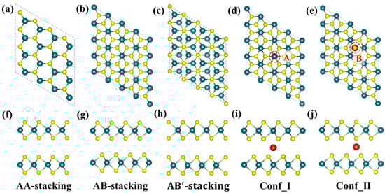 Top and side views of (a,f) AA-, (b,g) AB-, and (c,h) AB′- stacking of bilayer MoS2. Top and side views of TM@BL_MoS2 with TM intercalating in the (d,i) A site and (e,j) B site.