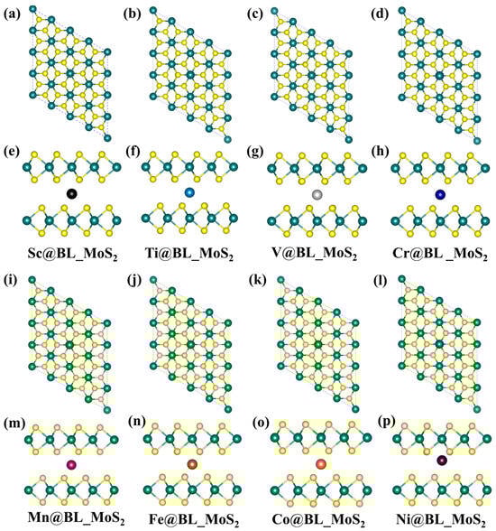 (a–d,i–l) Top views and (e–h,m–p) side views of the optimized structures for TM@BL_MoS2s (TM = Sc–Ni).