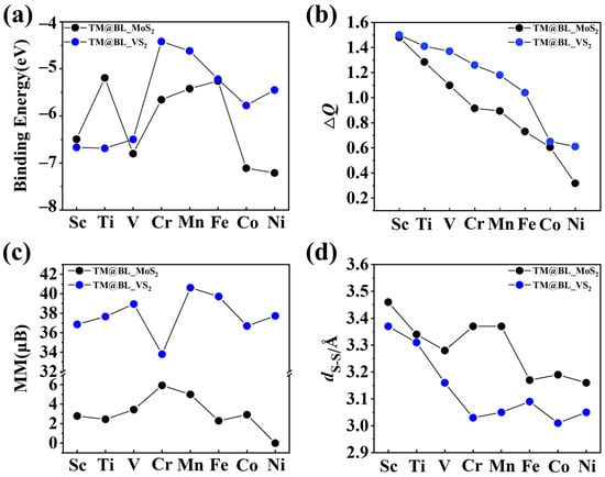 where ETotal, ETM, and EMS2 represent the total energy of the TM@BL_MS2, the isolated transition metal atom, and the free-standing Mo(V)S2 bilayers, respectively. As shown in Table 1 and Figure 3a, the calculated Ebs are around −7.21~−5.19 eV and −6.69~−4.23 eV for TM@BL_MoS2s and TM@BL_VS2s, respectively, which are comparable to those of TM-intercalated graphene/TMD heterostructures []. Such large negative Eb values indicate that the intercalation of TM atom in Mo(V)S2 bilayers is energetically favorable. In the case of TM@BL_MoS2, the Eb of Ni@BL_MoS2 system is the lowest (−7.21 eV), and that of Ti@BL_MoS2 is the highest (−5.19 eV). For the TM@BL_VS2 system, the Eb of Ti intercalation system is the lowest (−6.69 eV), and that of Cr intercalation system is the highest (−4.23 eV).