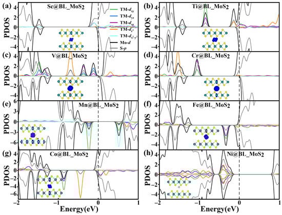(a–h) Partial density of states (PDOS) and spin density plots for TM@BL_MoS2 (TM = Sc–Ni). Inside the PDOS graph is its corresponding spin density graph; blue represents positive spin, and red represents negative spin.