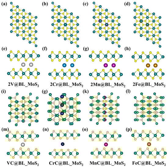 (a–d,i–l) Top views and (e–h,m–p) side views of the optimized structure of 2TM@BL_MoS2s and TMC@BL_MoS2s (TM = V, Cr, Mn, Fe), respectively.